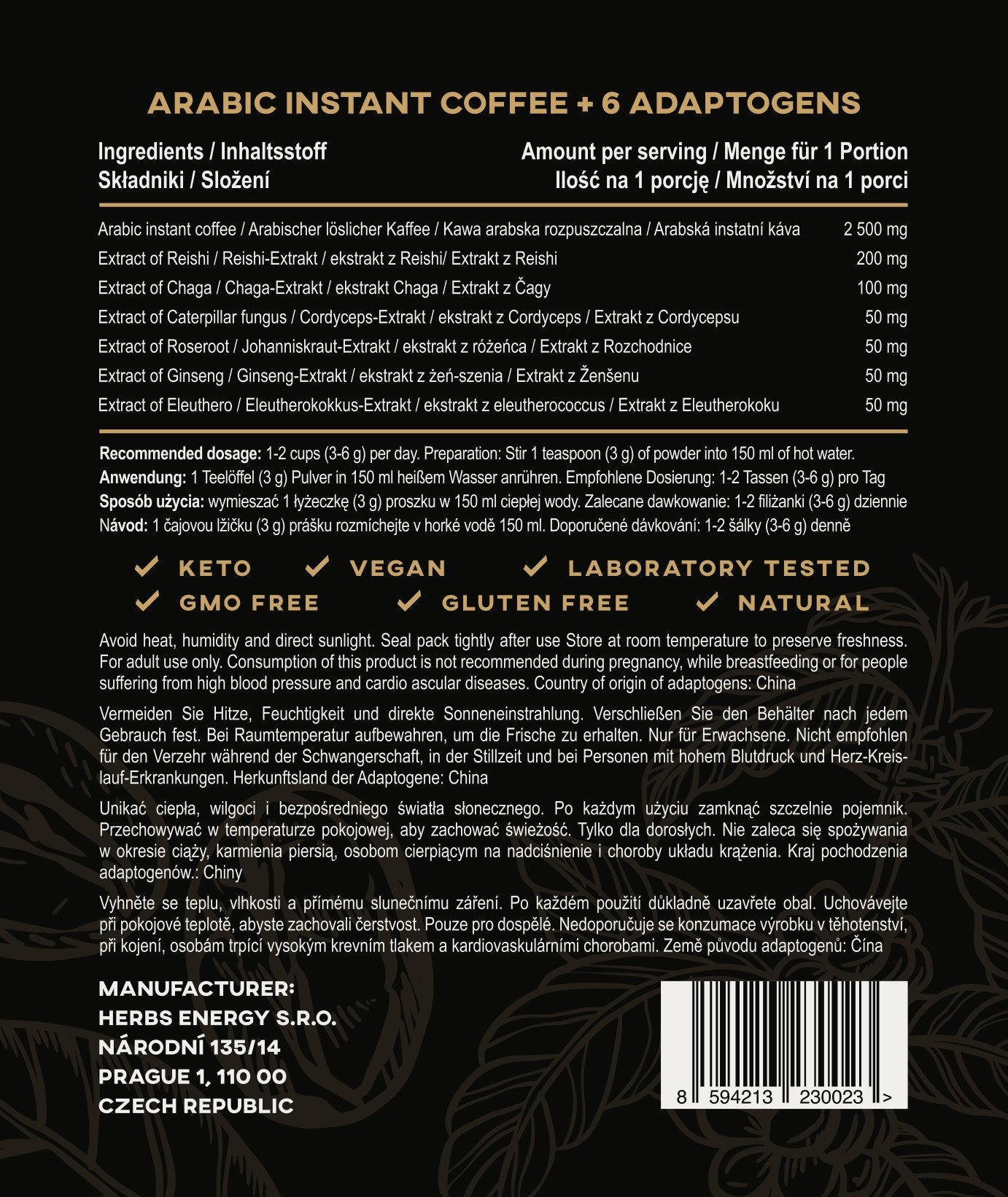 Balení obsahuje 33 porcí (100 g) špičkové instantní arabské kávy té nejvyšší kvality obohacené o reishi a dalších 5 extraktů z adaptogenů. Adaptogeny jsou přidány v takovém množství, abychom docílili maximálního účinku při zachování skvělé chuti.